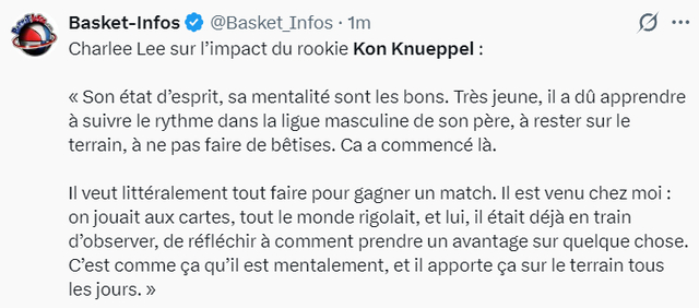 克努佩尔的队友布兰登-米勒谈到弗拉格与克努佩尔的最佳新秀之争,他说道:我从第一天开始就说克努佩尔就是最佳新秀,我不想再说一遍。